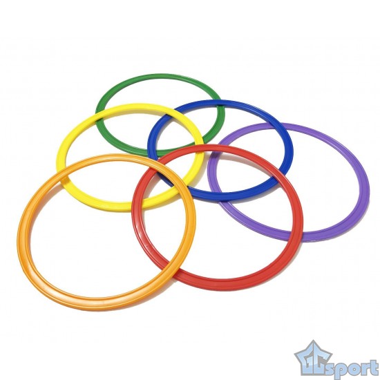 В комплекте 6 плоских обручtq разного цвета: синий, красный, желтый, зеленый, оранжевый, фиолетовый